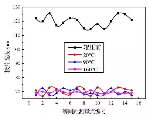 圖1為涂敷厚度為100μm的極片在不同軋制溫度下的厚度曲線,如圖所示,隨著軋制溫度由20°C增加為90°C再增加為160°C,極片厚度偏差由±1.9μm降低為±1.3μm再降低為±0.8μm,極片厚度一致性逐漸提高,這是因?yàn)殡S著軋制溫度的增加,極片涂層變形抗力減小,可塑性變好,使得極片表面厚度更加均勻。